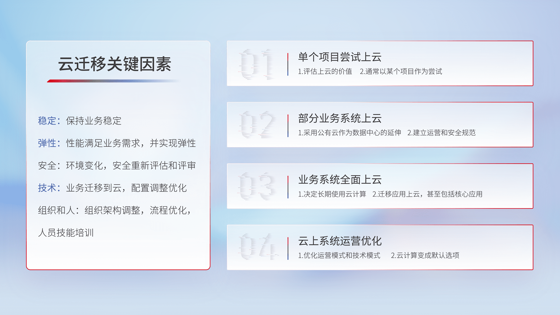 结合实际业务,,从规划设计、、云平台选型、、、云原生改造、、数据迁移、、、集成交付,,,迁移全过程为客户识别最佳上云路径,,做好风险识别管理,,设计网络架构、、、、身份权限、、安全审计合规、、、、操作审计、、、、日志审计、、、监控告警策略、、、、多站点容灾设计等,,,对云上基础设施进行整体规划,,,,提升IT治理水平,,以满足弹性、、高可用、、、高性能的需求。。